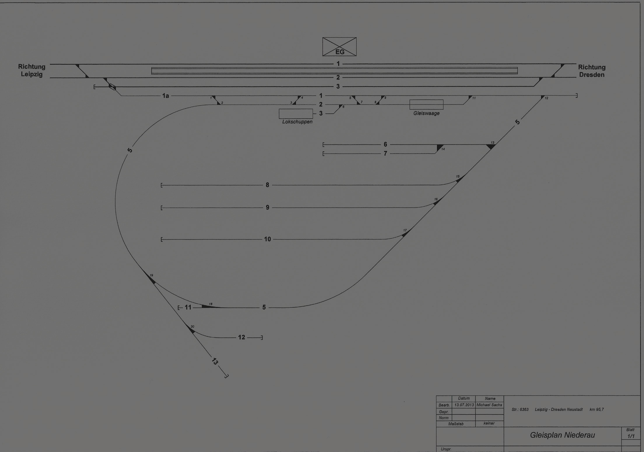 Im Mai 2013 haben wir die Anschlussbahn Niederau wieder in Betrieb genommen. Die Anbindung erfolgt über den Bahnhof Niederau an die Hauptbahn Dresden – Leipzig mit 24-stündiger Streckenöffnung. Auf einem Gleisnetz von rund 5 km findet regelmäßiger Eisenbahnbetrieb statt. Wir bieten hier Interessenten die Möglichkeit Triebfahrzeuge und Wagen kurz- oder längerfristig abzustellen. Die gesamte Anschlussbahn ist eingezäunt und wird rund um die Uhr durch ein Sicherheitsunternehmen bewacht. Auch kleine Wartungsarbeiten und eine Betriebsstoffergänzung an der vorhandenen Tankstelle sind möglich. Die An- und Abreisemöglichkeiten für Personale sind vom direkt angrenzenden Bahnhof mit dem RE 50 in Richtung Dresden oder Leipzig sowie mit dem RB 31 in Richtung Dresden oder Berlin ideal.